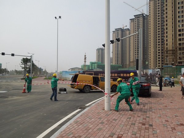 演練開(kāi)始。首先,2652111搶險(xiǎn)電話接到莆田市萬(wàn)科城溪園小區(qū)(尚濟(jì)路)北側(cè)建工地的施工單位的報(bào)警。該單位因進(jìn)行小區(qū)綠化平整工程建設(shè)的需要,動(dòng)用挖掘機(jī)施工,卻因?qū)芫€位置的不熟悉而盲目操作,致使我司敷設(shè)在工地內(nèi)的De110預(yù)留中壓管被鏟斷,造成燃?xì)獯罅啃孤叮F(xiàn)場(chǎng)白霧彌漫,并發(fā)出較為強(qiáng)烈的氣流聲。公司管網(wǎng)部門接到報(bào)警后,立即將事故初步情況上報(bào)有關(guān)領(lǐng)導(dǎo),并啟動(dòng)公司緊急預(yù)案。緊接著,調(diào)控中心立即對(duì)事故搶險(xiǎn)人員和突發(fā)事故應(yīng)急處理各小組人員進(jìn)行調(diào)度并協(xié)調(diào)宏盛市政工程公司做好搶修準(zhǔn)備。我司調(diào)控中心亦配合客服部向用戶發(fā)布緊急停氣通知。接到通知后,各搶險(xiǎn)和事故處理人員立即趕往事故現(xiàn)場(chǎng)。到達(dá)現(xiàn)場(chǎng)后,工作人員馬上疏散場(chǎng)外圍觀群眾,拉起警戒線,對(duì)有效區(qū)域隔離警戒;搶險(xiǎn)人員佩戴安全設(shè)備進(jìn)入事故現(xiàn)場(chǎng),查找泄漏點(diǎn),并及時(shí)對(duì)事故點(diǎn)進(jìn)行搶修。各搶險(xiǎn)和事故處理小組各司其職,相互配合,經(jīng)過(guò)多方搶修,事故最終得到解決。最后,總指揮指示客服部門向各小區(qū)用戶及物業(yè)管理發(fā)送短信通知恢復(fù)供氣,并通知人員撤離和解除緊急警報(bào)訊號(hào)。